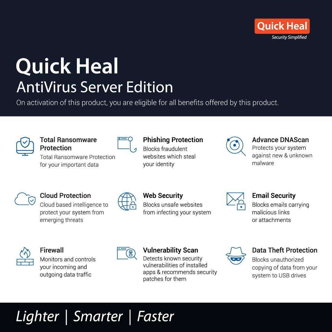 Quick Heal AntiVirus Server Edition offers comprehensive features such as Ransomware Protection, Wi-Fi Scanner, Anti-Keylogger, Advanced DNASCAN, various Scan Options, External Drive Security, Firewall, Vulnerability Scanning, Virus Defense, Phishing Prevention, Auto-Silent Mode, Email Security, Anti-Malware, Anti-Rootkit, Hijack Recovery, System Explorer, Safe Mode Security, External Drive Scanning, Data Theft Prevention, IDS/IPS, Registry Recovery, Browsing Protection, Smart Scan Engine, USB Drive Security, Automatic Backup, Settings Import and Export, Malware Defense, Track Cleaner, Laptop Tracking, Quick Heal Remote Device Management (RDM), and Enhanced Self-Protection for Servers.